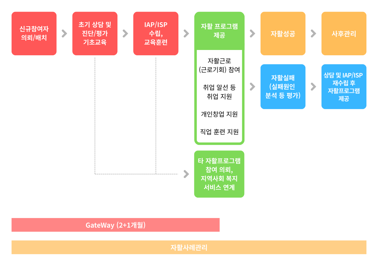 · 자활사업 참여전 진입(Gateway)과정을 프로그램화하여 개인별 자립경로(Individual Action Plan)와 개인별 자활지원계획(Individual Service Plan)을 기반으로 한 지원 실시